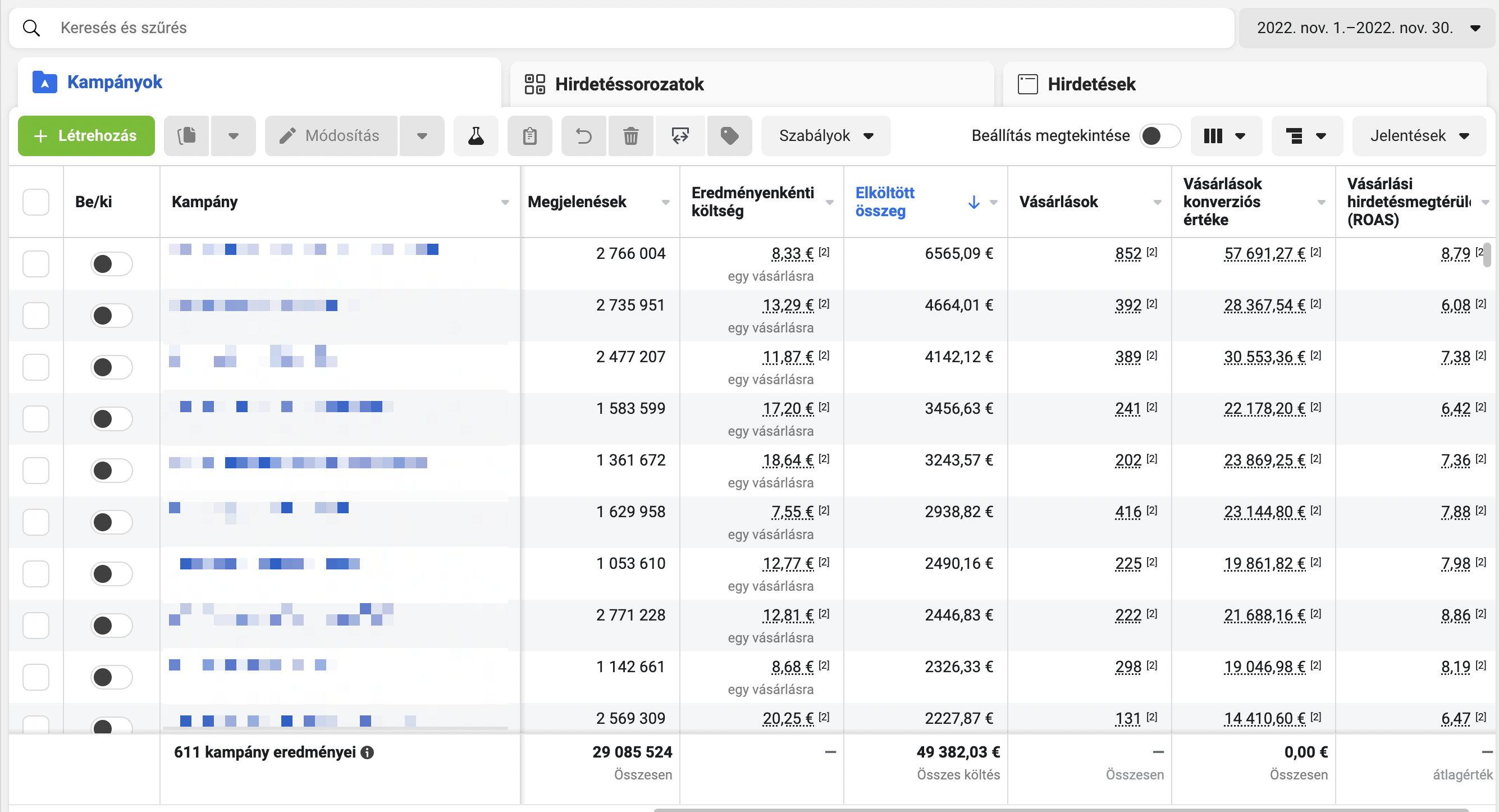 Itt egy nemzetközi webshop novemberi Black Friday kampány eredménye, ahol közel 50.000 eurót hirdettünk el nagyjából 8x-os megtérüléssel. 🤯